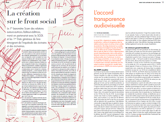 La loi de 2016, « Liberté de la création, architecture et patrimoine », renforce la transparence dans les relations entre les auteurs et autrices et leurs sociétés de production. Elle oblige dorénavant ces sociétés à communiquer les budgets et les plans de financement, de même que les comptes d’exploitation. Dans le cadre de cette loi, la Scam a négocié plusieurs accords interprofessionnels, dont un plus particulièrement consacré à la transparence des relations professionnelles dans l’audiovisuel. Au terme d’une longue concertation, un accord a été signé le 6 juillet 2017 et étendu par arrêté ministériel. Il comporte deux avancées importantes pour les auteurs et autrices concernant les « recettes nettes part producteurs » (RNPP) et le minimum garanti.