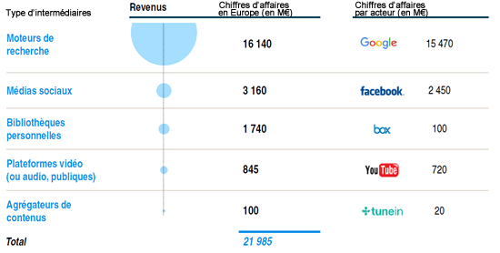 Les études d’usages montrent que les revenus des intermédiaires en ligne atteignent en Europe 21.985 millions d’euros (en 2014) et sont concentrés pour 88% sur les moteurs de recherche (notamment Google avec plus de 15 Mds d’euros de chiffre d’affaires) et les réseaux sociaux (Facebook avec 2,5 Mds d’euros) ; Les plateformes vidéos étant loin derrière (YouTube représentant 700 millions d’euros).