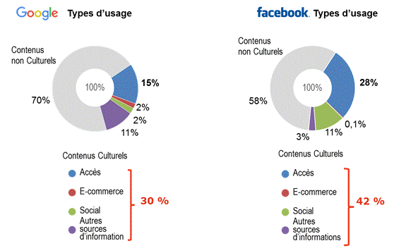 Les biens culturels représentent une part significative des usages de Google et de Facebook (30 % des sites visités après une requête sur Google et 42 % de toutes les actions effectuées sur Facebook).