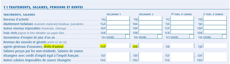 Désormais, les revenus perçus en droit d’auteur et imposables selon le régime des traitements et salaires doivent être déclarés dans les cases 1GB ou 1HB (et non dans les cases 1AJ ou 1BJ comme habituellement). Cette modification ne concerne pas les droits d'auteur déclarés en BNC.