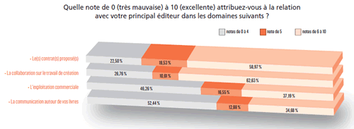 Mais si la note passe à 6,2 pour les contrats proposés et la collaboration sur le travail de création, elle n’est que de 4,6 pour l’exploitation commerciale et même de 4,2 pour la promotion et la commercialisation. L’écart continue de se creuser au fur et à mesure de la vie du livre.