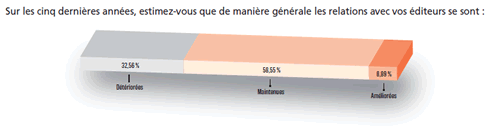 Cependant, ils sont 40 % à estimer qu’elles sont non satisfaisantes avec tout ou partie de leurs éditeurs, et 15 % qu’elles sont même conflictuelles. Ils sont, à l’inverse, 69 % à estimer que ces relations sont satisfaisantes avec tout ou partie de leurs éditeurs, et 26 % qu’elles sont même excellentes.