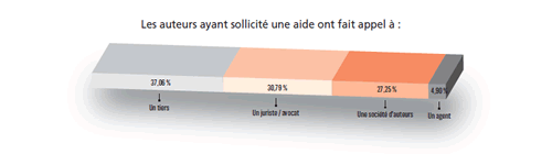 Si les auteurs négocient seuls leurs contrats et ne sont que 8 % à envisager de recourir prochainement aux services d’un agent, ils sont 40 % à demander une aide extérieure pour lire leurs contrats. Parmi ceux-là, 37 % des auteurs les font relire à un tiers, 31 % à un juriste et 27 % à une société d’auteurs.