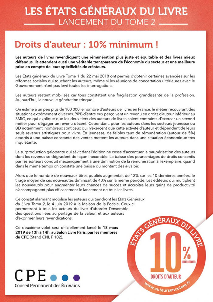 Ce constat alarmant mobilise les auteurs qui tiendront les Etats Généraux du Livre Tome 2, le 4 juin 2019 à la Maison de la Poésie. Ceux-ci permettront à tous les acteurs du livre d’aborder l’ensemble des questions liées au partage de la valeur, et aux auteurs d’exprimer leurs revendications.
