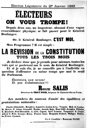 * ÉLECTEURS on vous trompe ! est le titre de l’affiche de Rodolphe Salis, candidat aux élections législatives du 27 janvier 1889.