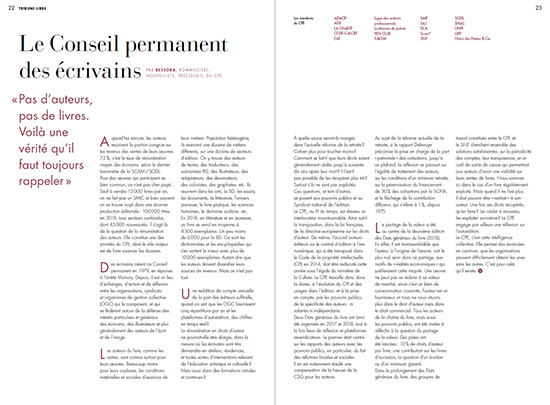 À quelle sauce seront-ils mangés dans l’actuelle réforme de la retraite ? Cotiser plus pour toucher moins ? Comment se fait-il que leurs droits soient généralement cédés jusqu’à soixante-dix ans après leur mort ? N’est-il pas possible de les récupérer plus tôt ? Surtout s’ils ne sont pas exploités. Ces questions, et tant d’autres, se posent aux pouvoirs publics et au Syndicat national de l’édition. Le CPE, au fil du temps, est devenu un interlocuteur incontournable. Ainsi suit-il la transposition, dans la loi française, de la directive européenne sur les droits d’auteur. De même, l’accord auteurs-éditeurs sur le contrat d’édition à l’ère numérique, qui a été transposé dans le Code de la propriété intellectuelle (CPI) en 2014, doit être rediscuté cette année sous l’égide du ministère de la Culture. Le CPE travaille donc dans la durée, à l’évolution du CPI et des usages dans l’édition, et à la prise en compte, par les pouvoirs publics, de la spécificité des auteurs : ni salariés ni indépendants.