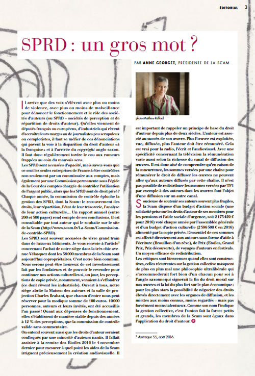Les SPRD sont accusées d’opacité, mais savez-vous que ce sont les seules entreprises de France à être contrôlées non seulement par un commissaire aux comptes, mais également par une Commission permanente sous l’égide de la Cour des comptes chargée de contrôler l’utilisation de l’argent public, alors que les SPRD sont de droit privé ? Chaque année, la commission de contrôle épluche la gestion des SPRD, dont la Scam : le recouvrement des droits, leur répartition, l’état de leur trésorerie, l’analyse de leur action culturelle… Un rapport annuel (entre 200 et 300 pages) rend compte de ses conclusions. Il est consultable par tout auteur qui le souhaite sur le site de la Scam.