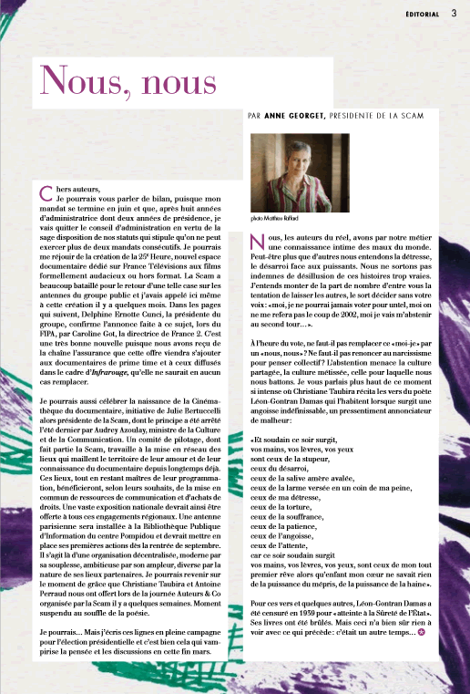 Je pourrais aussi célébrer la naissance de la Cinémathèque du documentaire, initiative de Julie Bertuccelli alors présidente de la Scam, dont le principe a été arrêté l’été dernier par Audrey Azoulay, ministre de la Culture et de la Communication. Un comité de pilotage, dont fait partie la Scam, travaille à la mise en réseau des lieux qui maillent le territoire de leur amour et de leur connaissance du documentaire depuis longtemps déjà.