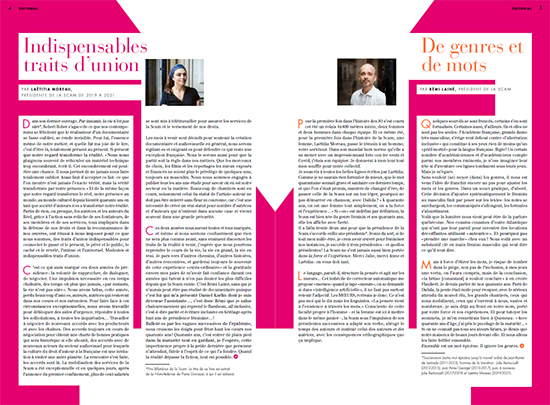 Les éditos de Laëtitia Moreau, présidente de la Scam de 2019 à 2021, et Rémi Lainé, président de la Scam.