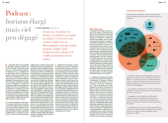 En septembre 2016, la Scam publiait une étude consacrée à la place des auteurs à la radio et faisait le constat que, si les auteurs étaient nombreux, les diffuseurs, eux, se comptaient sur les doigts d’une main. Le paysage de l’audio en France était « bouché ». Cette étude d’une cinquantaine de pages en consacrait deux au podcast, marché balbutiant. Trois ans plus tard, l’horizon s’est élargi. D’artisanal, le podcast est devenu industriel : les studios de production prolifèrent et produisent de nombreuses heures de programmes, les plateformes et agrégateurs ouvrent de nouveaux canaux de diffusion, la profession a son magazine, Le Pod, dont le premier numéro est paru en juillet, et son festival, le Paris podcast festival, dont la deuxième édition s’est tenue à la Gaîté Lyrique en octobre dernier.