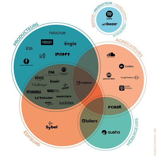 Le marché du podcast se structure, se professionnalise, s’organise. Il y a trois ans, un podcasteur était producteur, hébergeur et diffuseur de ses programmes. Il existe désormais ceux qui produisent, ceux qui diffusent et ceux qui hébergent. Engle, L’Officine, Podcut, Insider, Les Écrans sonores, Bababam (nous ne pouvons pas tous les citer) ont rejoint les déjà historiques Binge Audio, Nouvelles Écoutes et Louie Media. Les plateformes et agrégateurs Sybel, Majelan, Tootak ou Elson sont les nouveaux venus qui valorisent et commercialisent des productions tierces ou propres. Ausha, Acast proposent des solutions d’hébergement, de gestion et de monétisation aux producteurs.