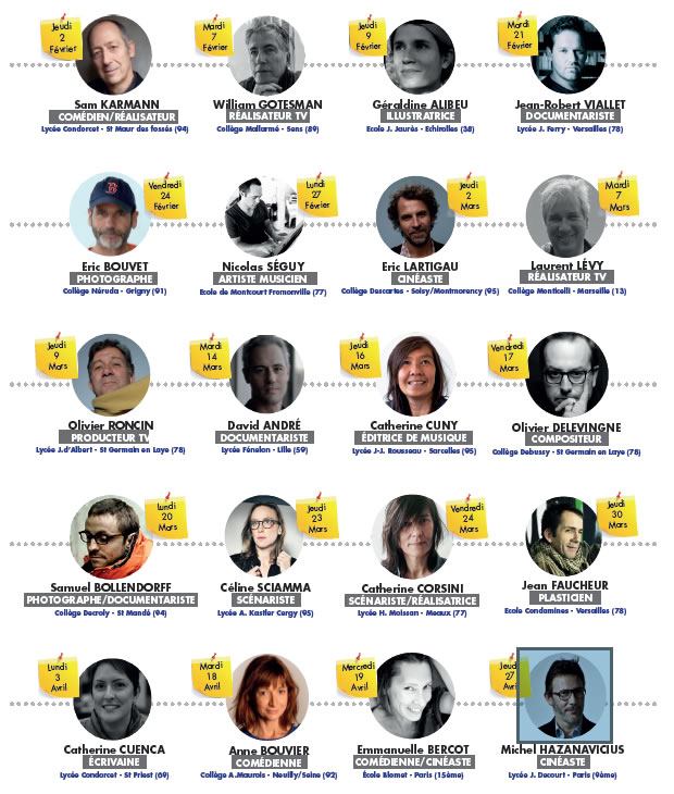 Réunis autour de la scénariste et réalisatrice Catherine Corsini, marraine de l’événement, auteure de films sensibles et engagés comme La Nouvelle Eve et plus récemment La Belle saison, 20 créateurs de Sam Karmann le 2 février à Michel Hazanavicius le 27 avril se mobilisent pour la jeunesse et la culture !