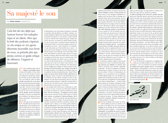 Plutôt que de séparer le bon grain de l’ivraie, Syntone préfère concentrer son attention sur le bon grain, et se féliciter de ce que les promeneurs engagés sur les chemins du son, quel qu’il soit, soient toujours plus nombreux… « Les podcasts se développant, la possibilité de toucher un public plus large grandit elle aussi », se réjouit l’homme à l’oreille sensible. Plus on est de fous, plus on rit ! « Il vaut mieux créer des liens entre les uns et les autres plutôt que d’encourager une fragmentation à l’intérieur d’un milieu pas si gros que ça », appuie sa comparse. Ce désir de partage et de communion constitue l’une des raisons pour lesquelles Syntone, avec ses trois à quatre mille visiteurs mensuels, reste d’accès gratuit. Façon de continuer à « divulguer au plus grand nombre notre amour du son », reprend Noiseau, qui, en 2013, a tiré les conclusions qui s’imposaient du succès et de la reconnaissance professionnelle acquis par Syntone : « puisque notre travail avait de la valeur aux yeux de certains », peut-être était-il temps de se rémunérer pour continuer à le faire. Une opération de financement participatif plus tard, la Scam et la SACD (aujourd’hui retirée du projet) ont apporté leur soutien et une revue est née, qui permet, grâce à ses quelques trois cents abonnements, dont une quinzaine de librairies, de faire fonctionner cette résidence de beaux textes, de sons, de comptes rendus d’événements, de dossiers thématiques, mais aussi d’informations pratiques sur des stages, des bourses, des festivals – une vraie malle aux trésors. Dans un monde de promesses sonores toujours renouvelées, l’avenir offre de belles perspectives. « Il y a dans la création sonore et son écoute une alternative aux écrans, assure M. Syntone. J’écoute du son pour me déconnecter non pas du monde ou de la vie, mais des réseaux sociaux. La question est : est-ce qu’on s’accorde encore du temps pour ne « rien » faire, comme lire, ou écouter une création radiophonique ? » Ne pas irriguer ses oreilles n’est pas un tort, mais un bonheur à côté duquel il est dommage de passer.